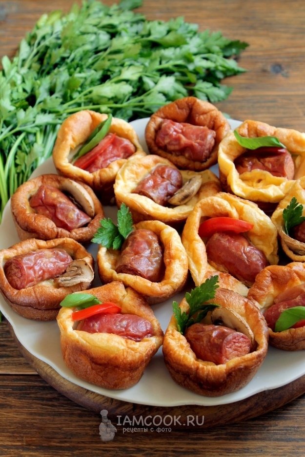 Один из вкусных вариантов сосисок в тесте — на основе Йоркширского пудинга. Такой понравится тем, кто выбирает минимум мучной оболочки. Начинка по этому рецепту запекается в жидком блинном тесте. После подъема тесто трескается, оседает и сосиски видны наружу, отсюда и название Жаба в норке.