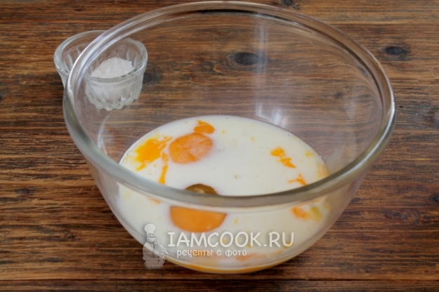 Первыми взбалтываем жидкости: молоко и яйца. Солим.