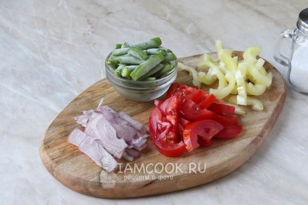 Тем временем подготовить овощи. Помыть их и, по надобности, очистить. Лук нарезать полукольцами, болгарский перец - соломкой, а помидоры - ломтиками. Спаржевую фасоль я использовала замороженную, если у вас свежая - срежьте с неё жёсткие участки, а сами стручки разрежьте на несколько частей.