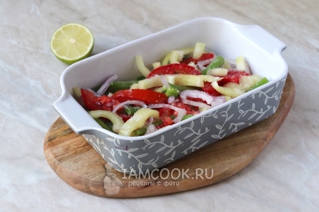 Овощную нарезку отправить в жаропрочную форму и слегка подсолить.