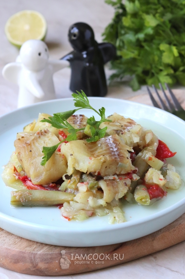 Вот и всё, очень вкусное, сочное филе минтая с овощами, запечённое в духовке, готово. Переложить его на порционную тарелку и в горячем виде подать на стол.