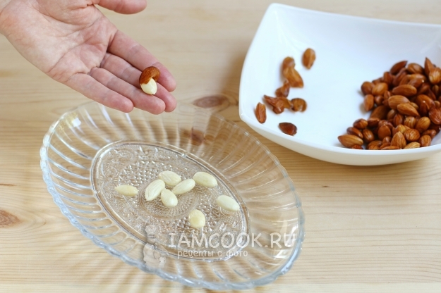 Сразу сливаем воду и с легкостью счищаем с каждого орешка шкурку просто пальцами. Миндаль будет буквально выпрыгивать из шкурок, достаточно только придавить его двумя пальцами.