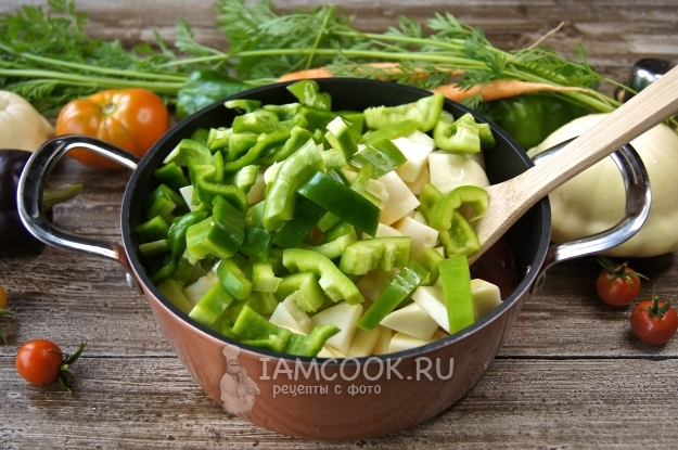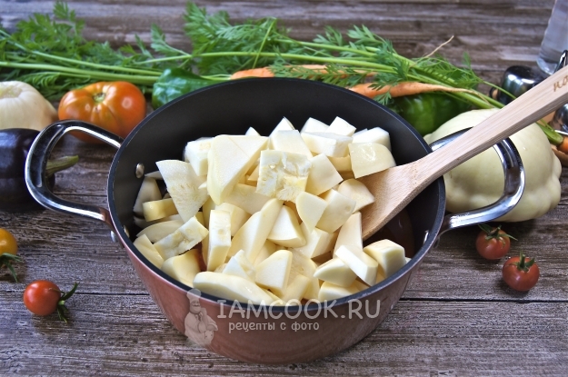 Патиссоны нарежем на средние кусочки, но не мельчим.