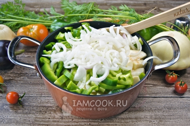 Лук нарежем полукольцами. Поставим на сильный огонь, после закипания убавим огонь на умеренный, накроем крышкой и тушим 30 минут.