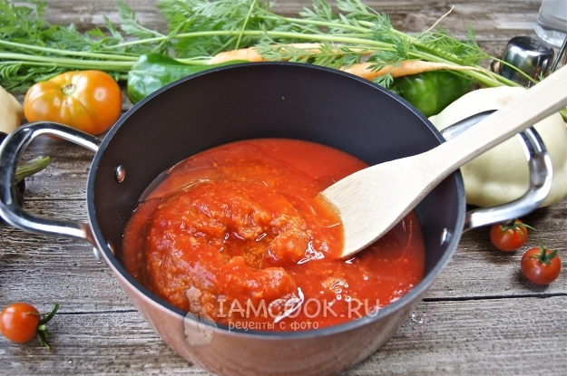 Выложим овощное пюре в латку с толстым дном, чтобы лечо в процессе приготовления не пригорело.