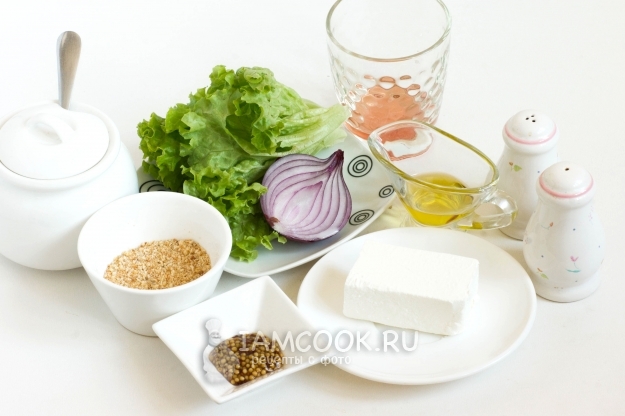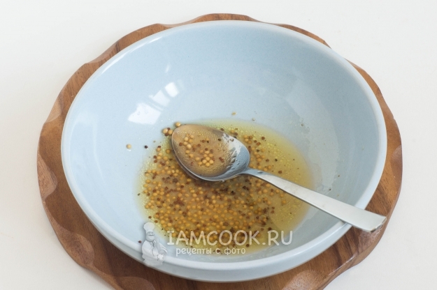 Приготовьте заправку, соединив соль, сахар, горчицу с зернышками и красный винный уксус, черный молотый перец. Перемешайте. Достаточно интенсивно взбивая заправку ложкой или венчиком, тонкой струйкой влейте оливковое масло.
