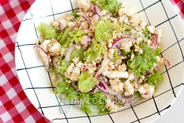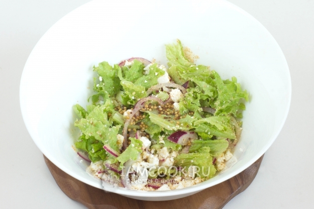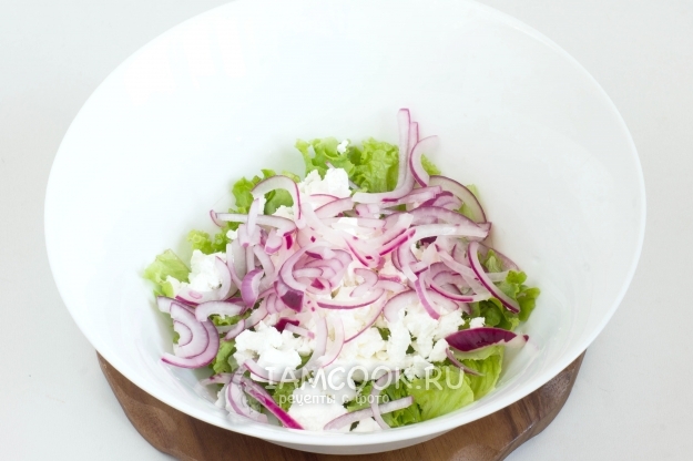 Листовой салат промойте, встряхните и руками порвите на небольшие кусочки. Сыр фета раскрошите также руками и добавьте в салат. Добавьте измельченный фиолетовый лук.