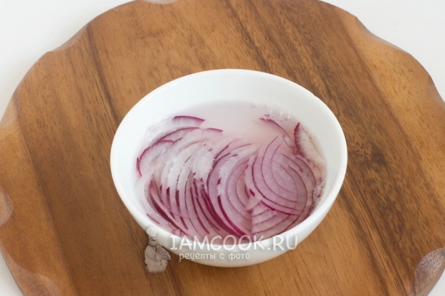 Фиолетовый лук почистите и тонко нарежьте кольцами или полукольцами. Это не обязательный прием, но если вы хотите уменьшить резкость лука, то залейте его на несколько минут кипящей водой. Затем воду слейте.