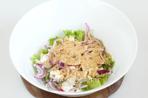 Хлебные крошки поджарьте на сухой сковородке до легкого подрумянивания, остудите и положите в салат.