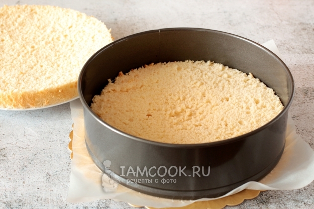 Остывший бисквит разрежьте на два коржа. Собирайте торт в форме, чтобы он не заваливался на бок и оставался всегда ровным. Выложите нижний корж в форму и пропитайте его сиропом. Я не делала сироп, просто соединила горячую воду с сахаром и добавила немного черносмородинового ликера. Можно пропитать корж компотом, можно взять просто воду с сахаром или любую жидкость по вашему вкусу. Без пропитки тоже возможно обойтись, но с ней тортик получается еще нежнее. Сахар в пропитку добавляйте по вашему вкусу, сладкоежкам же понадобится граммов 50-80 на 200 мл воды.