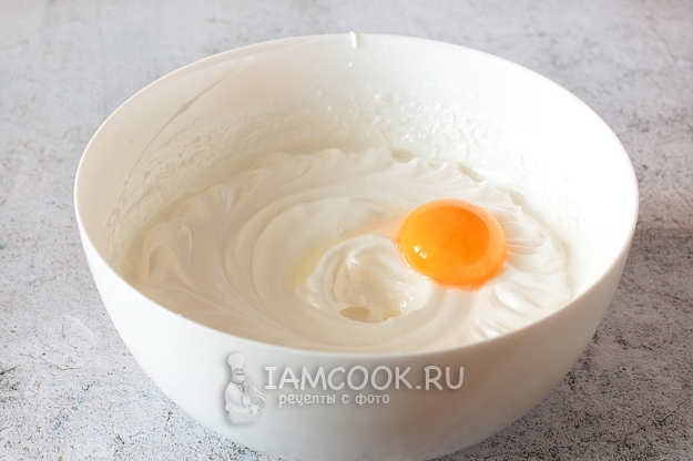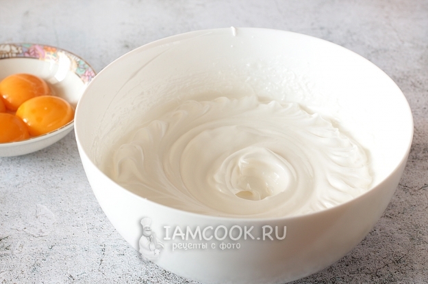 Духовку разогрейте до 180 градусов. Яйца разделите на белки и желтки. Если у вас имеется хороший стационарный миксер, то можно взбивать яйца целиком. У меня пока нет стационарного миксера и я делю яйца на белки и желтки для более качественного взбивания. В белки добавьте щепотку соли и слегка взбейте до легкой пены.