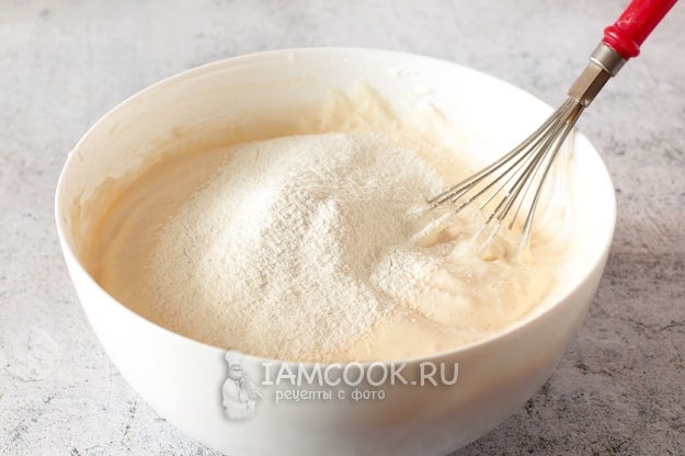 В два захода просейте в полученную массу муку с ванилином и тихонько размешайте ручным венчиком, не делая широких движений. Просто смешивайте тесто по кругу, не затягивая этот процесс, чтобы тесто не опало. Аккуратно проработайте венчиком дно, там часто оседает мука. Тесто должно остаться пышным и не опасть. Заметьте, никаких разрыхлителей здесь не применяем.