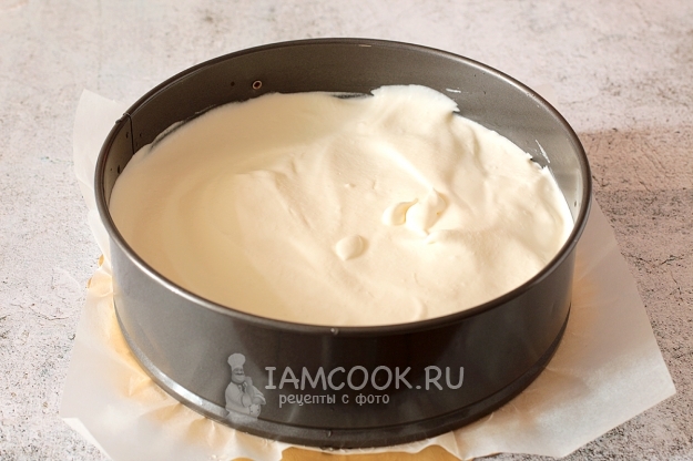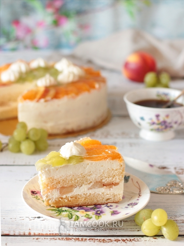 Залейте фрукты уже остывшим желе и поставьте в холодильник на полчаса. Затем освободите торт от формы и смажьте кремом бока. Дайте торту стабилизироваться в холодильнике еще несколько часов, у меня стоял ночь. После этого разрез получается ровным и чистым, а крем в разрезе похож на суфле.