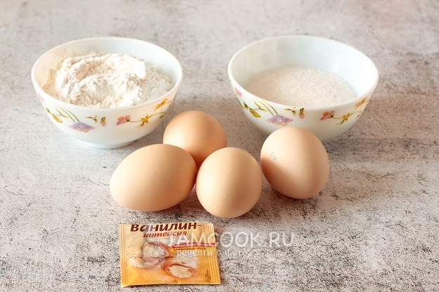 Чтобы приготовить фруктовый торт со сливками, возьмите необходимые ингредиенты. Сначала печем бисквит.