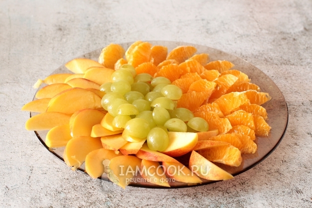 Подготовьте фрукты. Мандарины очистите и филетируйте, вырезая кусочки из шкурок ножом. Нектарины нарежьте тонкими ломтиками, виноград без косточек - пополам, а грушу - кубиками. У меня была очень спелая груша, поэтому было решено положить ее в середину. Разделите фрукты для начинки и украшения. Сбрызните их лимонным соком, чтобы не потемнели раньше времени, и накройте пленкой от заветривания.