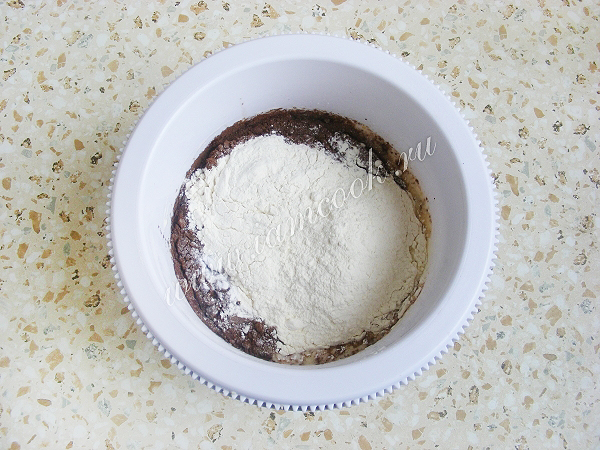 Добавить оставшиеся сухие ингредиенты: муку, разрыхлитель, какао, гвоздику. Так как у меня не оказалось молотой гвоздики, я целью измельчила в кофемолке с ложкой сахара.