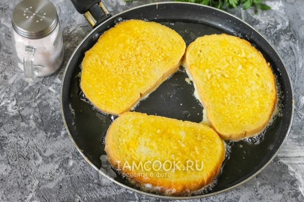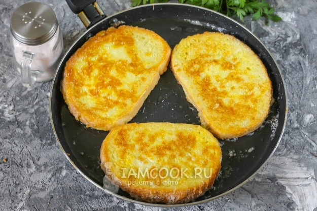 Затем переверните на другую сторону и томите такое же количество времени. Готовые гренки выложите на тарелку и дайте им остыть.