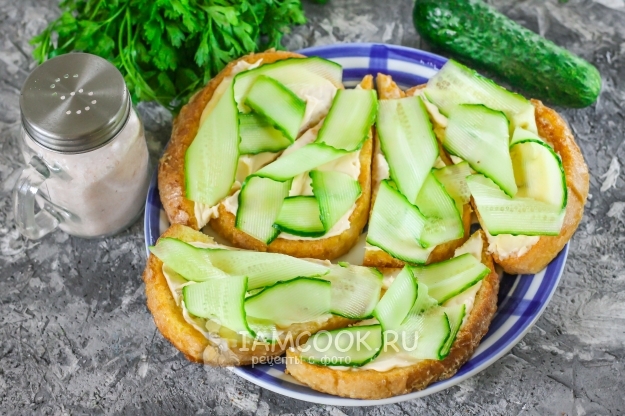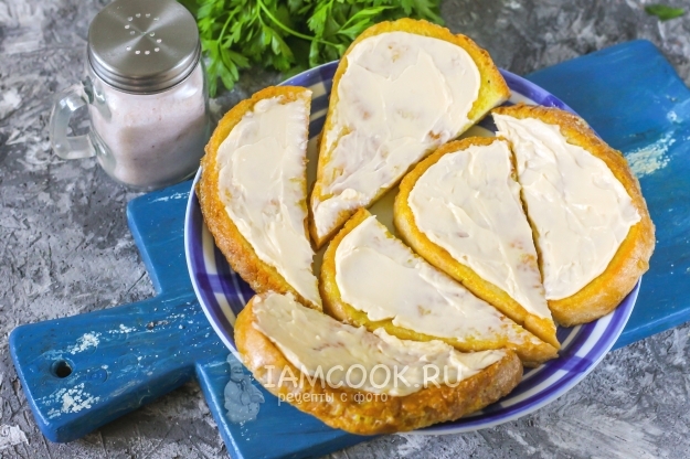 После остывания разрежьте по диагонали, если они крупные. Смажьте каждую часть плавленым сыром любого сорта.