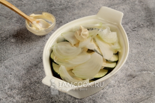 Накрываем кружками кабачка, снова приправляем специями и смазываем майонезом.