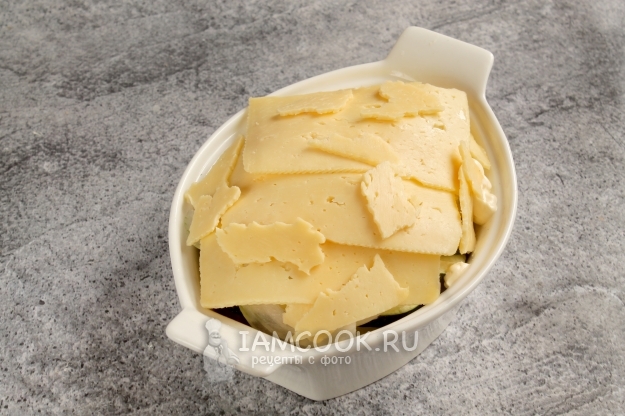 Последним раскладываем сыр, набрасываем фольгу, не прижимая, отправляем в раскаленную духовку на 30-35 минут, готовим при температуре 180 градусов. Последние минут 5 румяним без фольги.