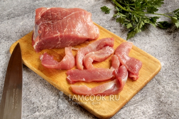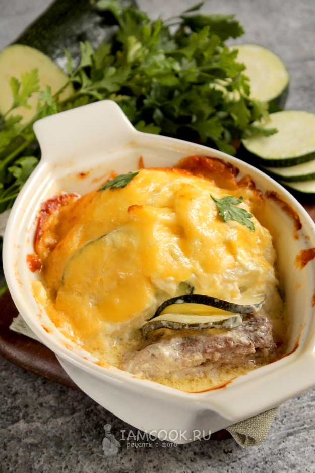 Водянистый кабачок дает мясу по-французски дополнительную влагу, заменяет гарнир и делает блюдо легче, чем, например, с картошкой. По своему усмотрению выбирайте свинину, говядину или птицу, тут нужна мякоть (филейная часть).