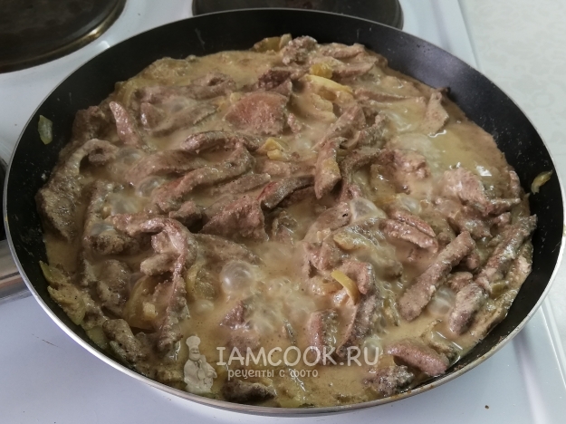 Затем добавляем сметану, а также черный перец и при необходимости соль. Размешиваем и ещё чуть-чуть тушим, где-то 3-5 минут. Главное, не передержать печень, так как чем дольше она готовится, тем больше вероятность, что она будет жёсткой.