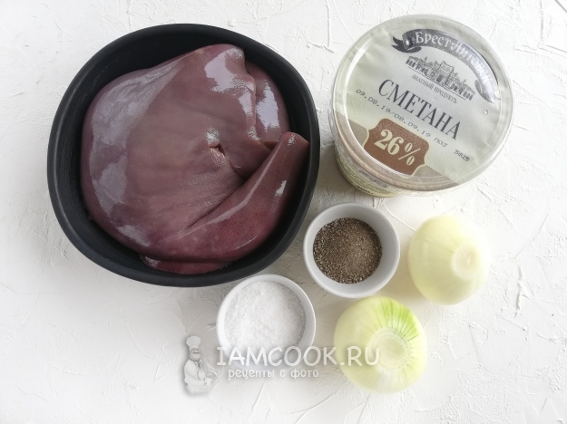 Продукты для приготовления свиной печени в сметане с луком на сковороде подготовим по списку ингредиентов.