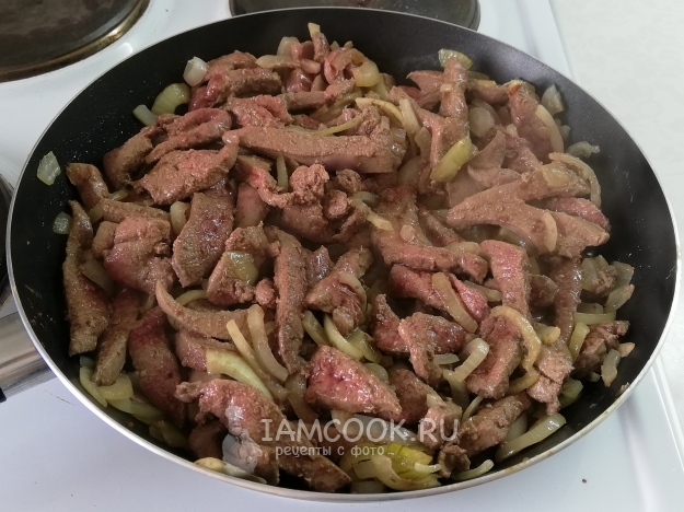Теперь пришла очередь печени. Кладём её на сковороду и перемешиваем с луком. Тушим на сковороде под крышкой примерно 5 минут, периодически помешивая.