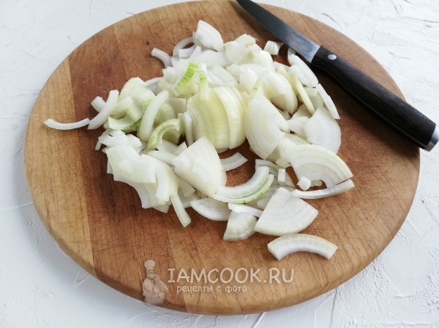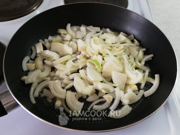 Разогреваем сковороду. Вливаем масло или кладём кусочек жира. Затем выкладываем лук и жарим его примерно 2-4 минуты до красивого золотистого цвета.