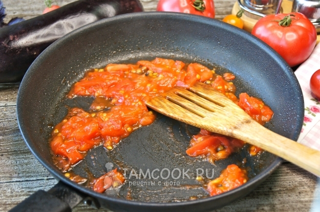 Помидоры вымойте и нарежьте на средние кусочки, выложите в сковороду и обжарьте, помешивая, на умеренном огне минуты 3.
