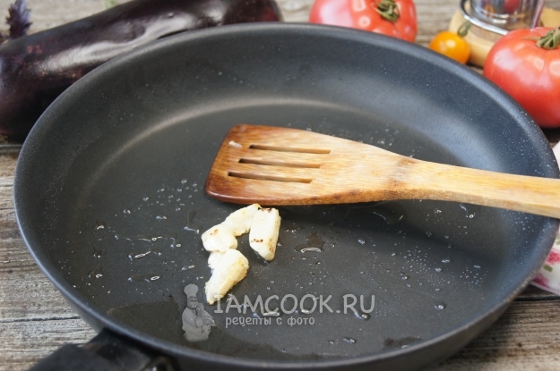 В эту же сковородку добавьте еще немного масла и раздавленный зубчик чеснока, обжарьте его до румяности и выбросьте, он отдал свой аромат маслу и больше нам не пригодится.