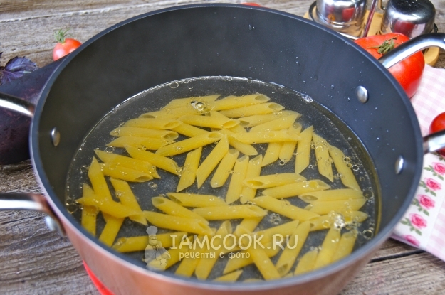 Далее вскипятите воду, ее должно быть большое количество, подсолите, добавьте буквально чайную ложку растительного рафинированного масла и всыпьте макароны твердых сортов пшеницы penne. Варите около 11 минут до состояния аль денте.