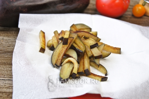 Обжаренные баклажаны выложите на бумажное полотенце или салфетку, чтобы стекло лишнее масло.