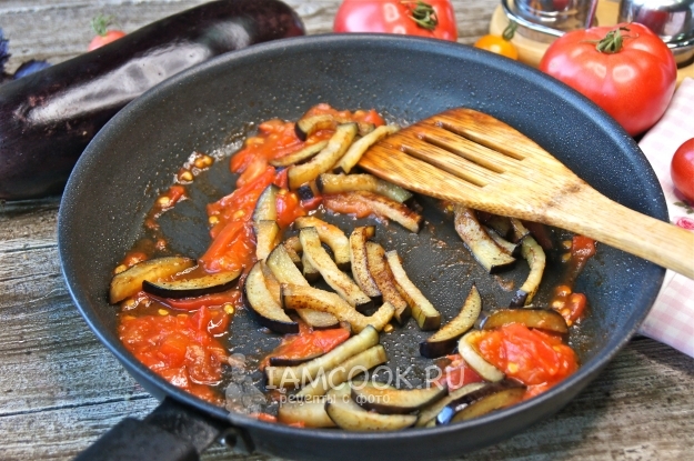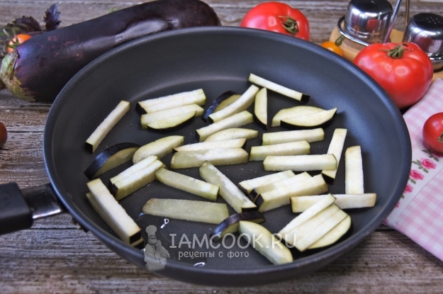 Затем вымойте баклажан, нарежьте на брусочки и обжарьте на сковороде с растительным маслом до румяности.