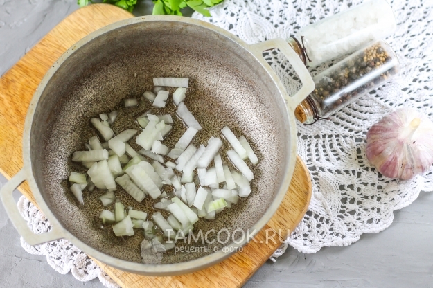 Очистите луковицу от шелухи, промойте в воде и нарежьте мелкими кубиками. Прогрейте в казане растительное масло и обжарьте в нем луковую нарезку примерно 2 минуты, до румяности.
