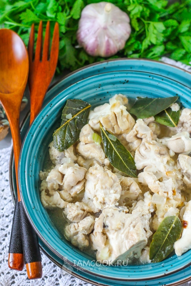 Добавьте в емкость нарезанные мозги, лавровые листья. Влейте теплую воду до середины объема субпродуктов. Поместите емкость на плиту и тушите около 5-6 минут на среднем нагреве, спрессовав туда же очищенные зубчики чеснока. Посолите и поперчите по вкусу.