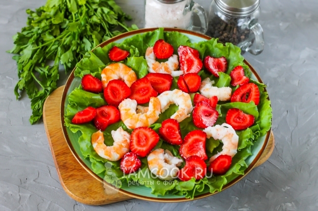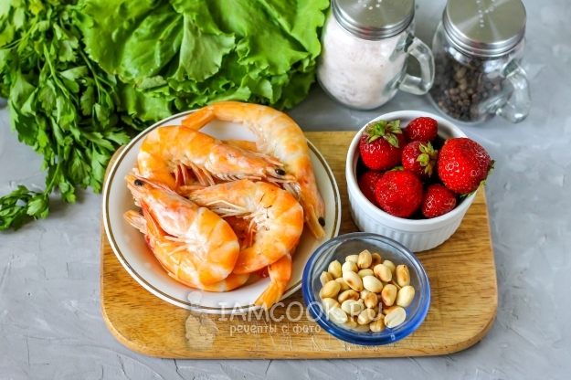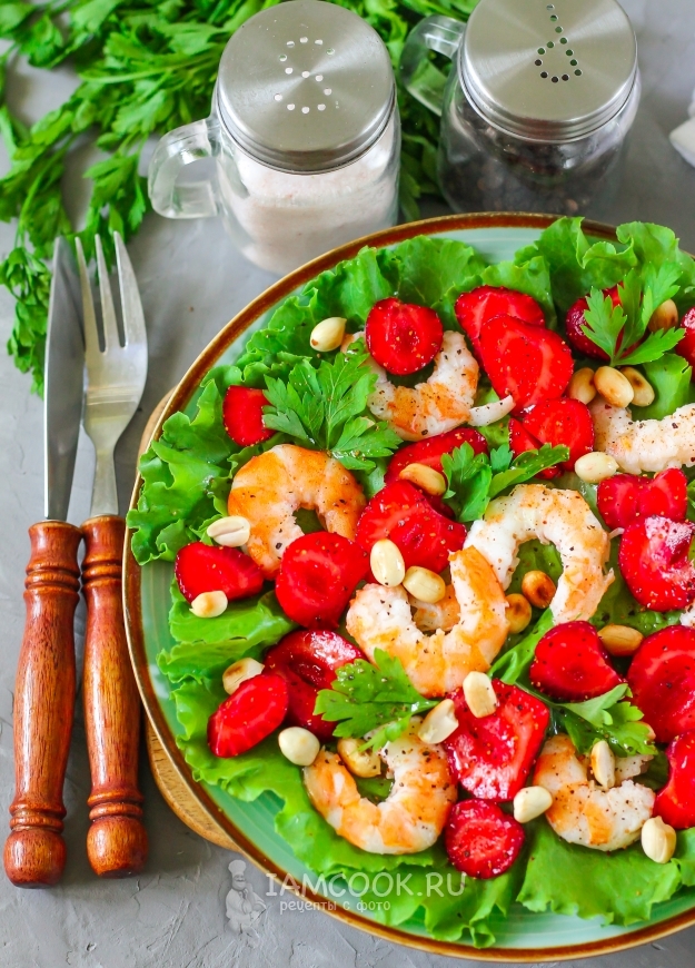 Если вы - настоящий кулинарный гурман, то обязательно попробуйте салат с креветками и клубникой, ведь от этого блюда с морепродуктами невозможно оторваться! Он получается некалорийным, аппетитным и практически диетическим. Орехи и растительное масло не осядут на ваших боках! Креветки продаются в любом супермаркете, но в вареномороженном виде, поэтому вам потребуется лишь прогреть их на минимальном нагреве около 1-2 минут в кипящей воде, а затем остудить и очистить. Помните, что из таких морепродуктов обязательно нужно удалять пищевод!