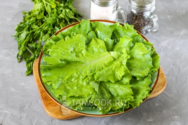 Промойте листовой салат, оборвите окончания стеблей, стряхните лишнюю жидкость и распределите салат по тарелке.