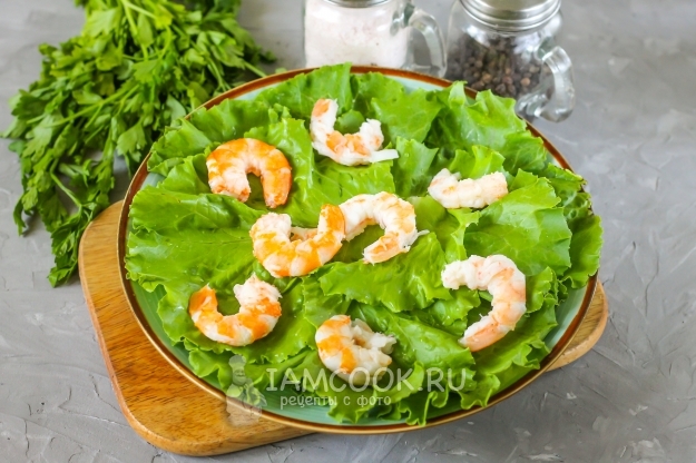 Выложите на листовой салат креветок.