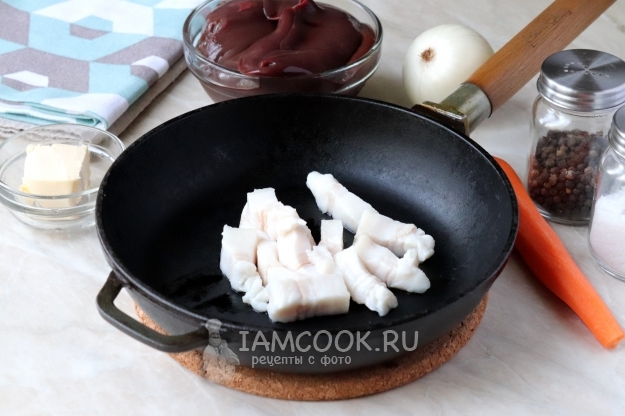 Свежее свиное сало (без шкуры) нарезать произвольными кусочками и выложить на сухую сковороду.