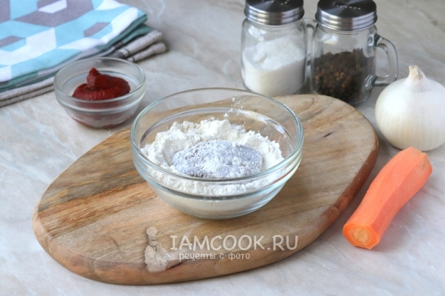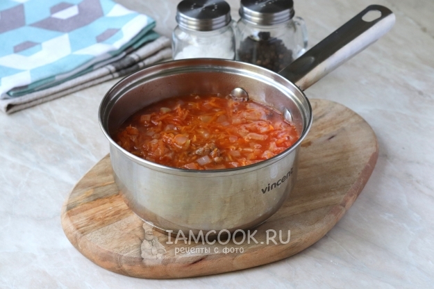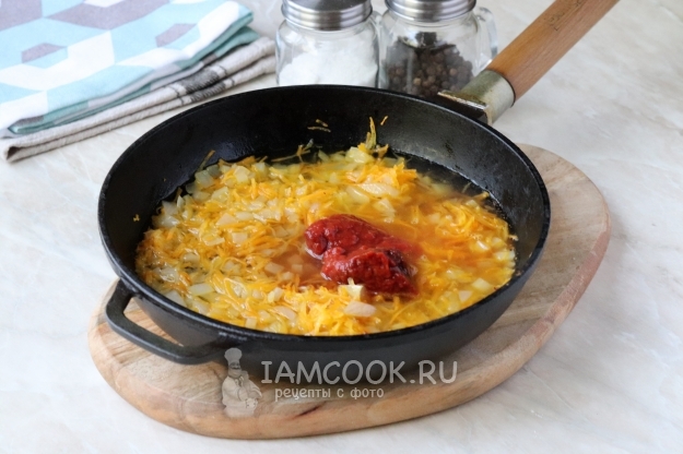 Жарить 5 минут, периодически помешивая. Затем добавить томатную пасту, воду, соль, чёрный молотый перец и немного сахарного песка. Перемешать.