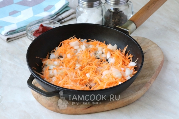 Измельчить очищенные овощи. Лук нарезать небольшими кубиками, морковь натереть на средней терке и отправить на сковороду с растительным маслом.