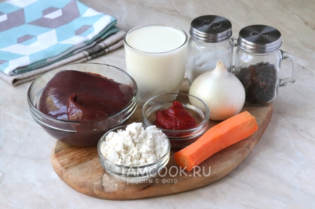 Для приготовления гуляша из свиной печени с подливкой подготовить продукты по списку к рецепту.