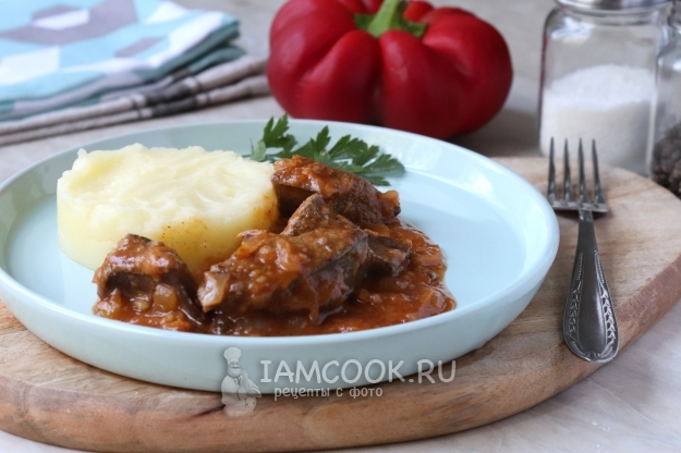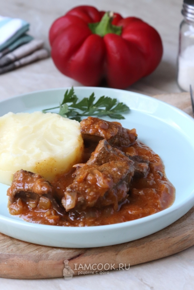 Подавать гуляш из свиной печени лучше в горячем виде с картофельным пюре или любым другим гарниром. Настоятельно рекомендую!