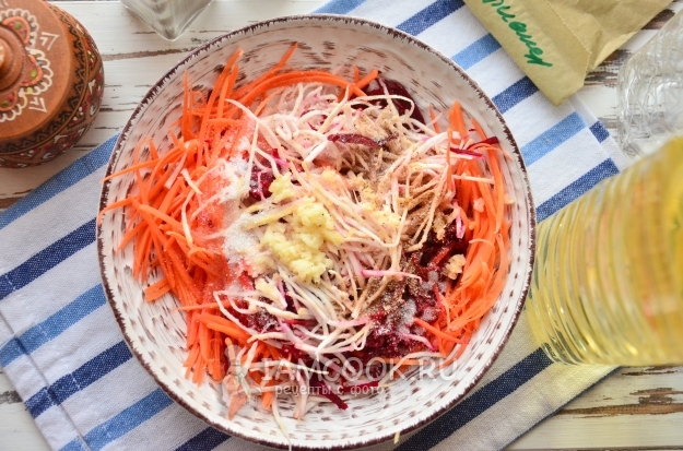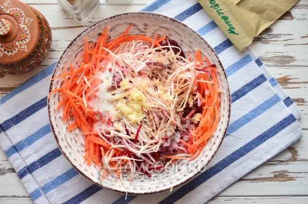 Теперь все перемешайте. Мне удобно перемешивать рукой - так добавляется возможность дополнительно помять овощи, чтобы они пустили сок и лучше пропитались специями. Однако можно перемешать и ложкой.