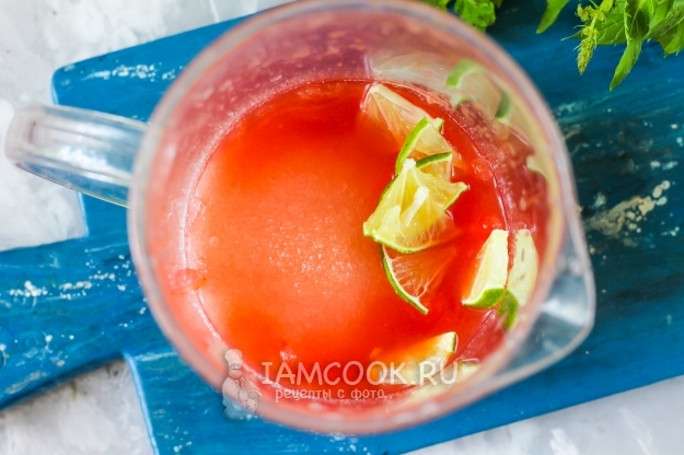 Добавьте лед, минеральную воду и перемешайте содержимое емкости. Нарежьте оставшуюся часть лайма и добавьте в емкость. Охладите мохито из арбуза в холодильнике и подайте к столу. Можно заранее охладить воду и тогда подать напиток к столу сразу же после создания.
