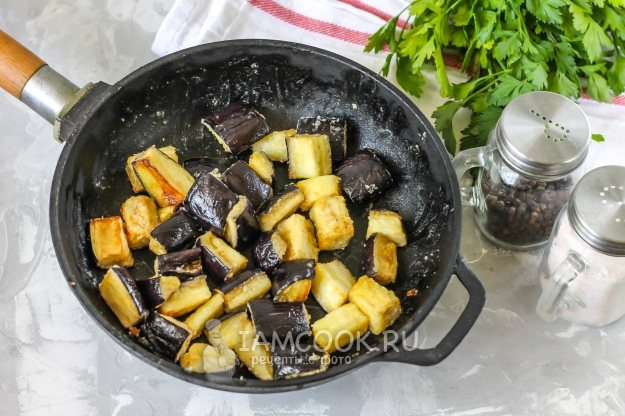 Выложите остывшие поджаренные баклажаны. Еще раз перемешайте.