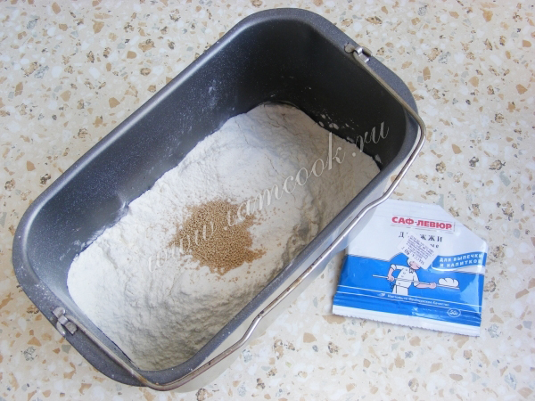 И дрожжи. Для них желательно сделать небольшое углубление в центре. Хлеб выпекать на программе «Белый хлеб» (3 часа, 20 минут).