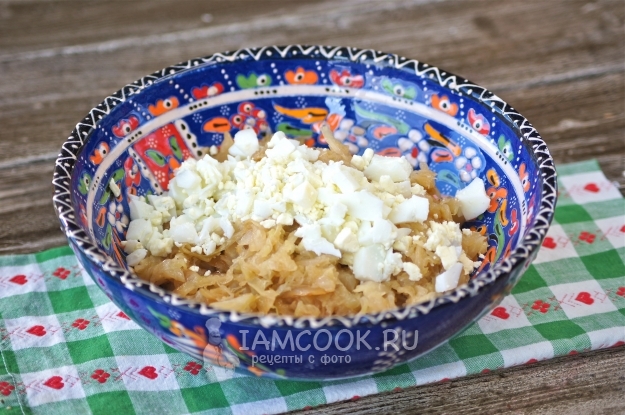 В капусту добавьте мелко нарезанное вареное яйцо, перемешайте.