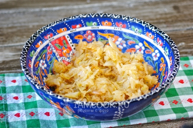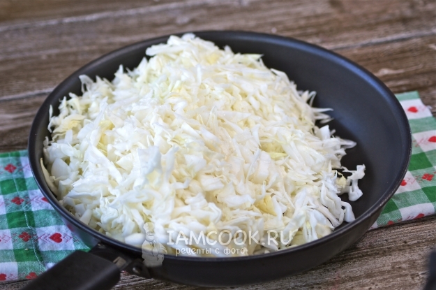Для начала нашинкуйте капусту, выложите в сковороду, налейте 150 миллилитров воды, прикройте крышкой и тушите до полного испарения жидкости, примерно минут 15 на сильном огне, за это время капуста размягчится.